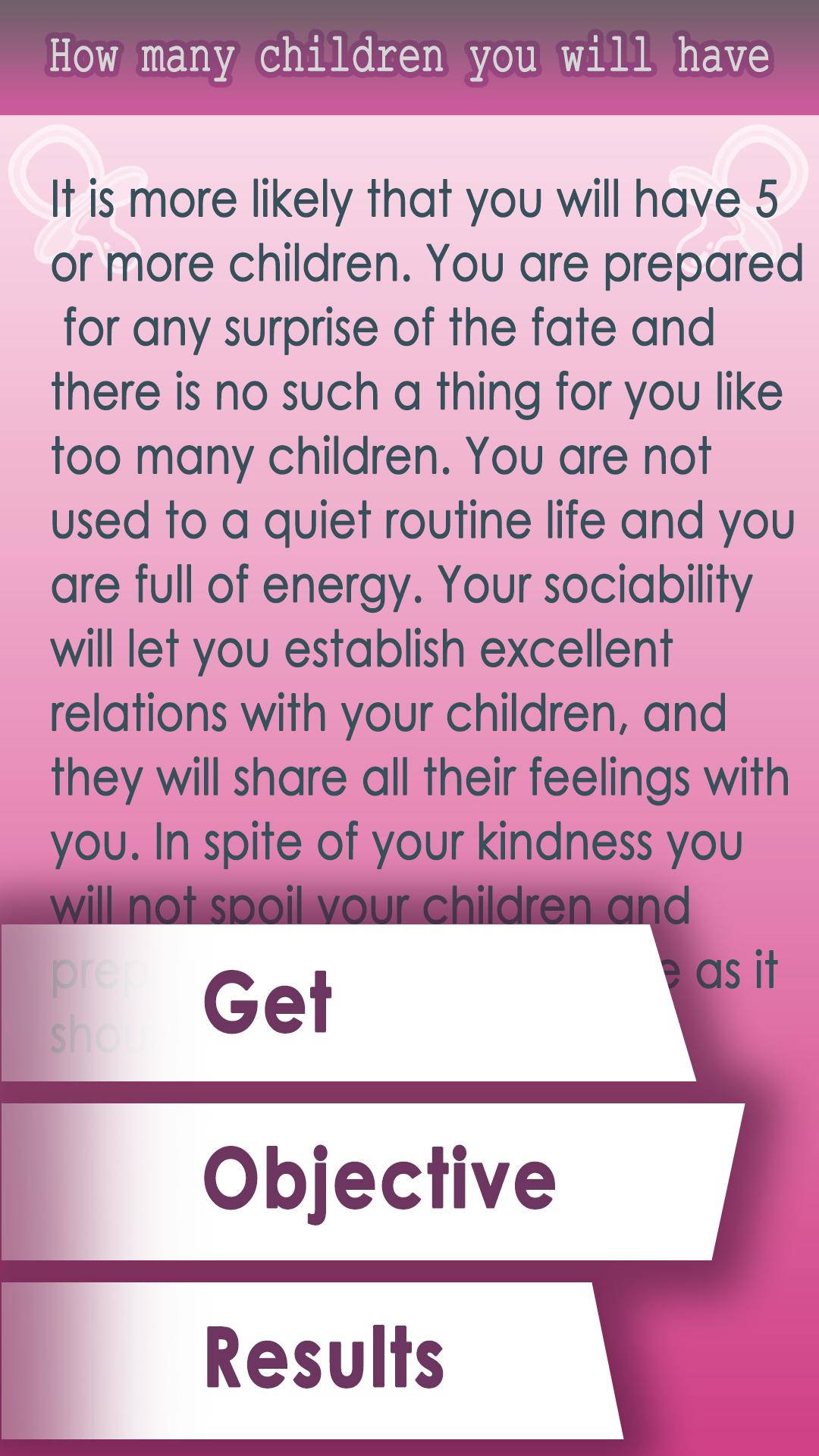 A child is a meaning of every person’s life, and pregnancy is the news that will bring happiness to any home. If you ask yourself “How many children will I have?” and every week make a pregnancy test waiting for a positive result you can pass the interesting test and know the forecast of how many children you will have. The attachment is based on your current way of living.
