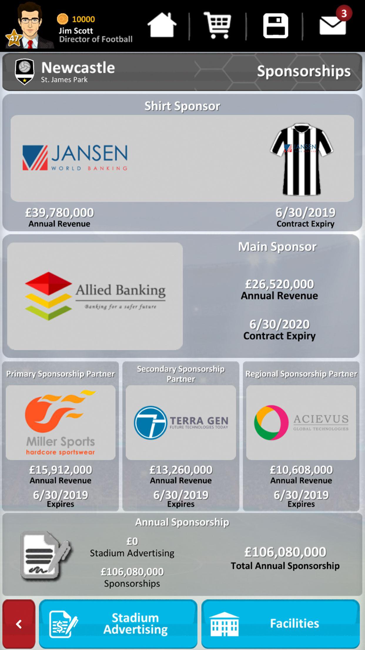 Kelola setiap aspek perkembangan klub Anda dan cara Anda menginvestasikan dana. Kembangkan dan tingkatkan fasilitas klub Anda, termasuk stadion, tempat latihan, dan Akademi Pemuda. Meningkatkan pendapatan dengan menegosiasikan sponsorship. Pekerjakan dan pecat tim manajemen Anda dan bangun skuad impian Anda dengan menegosiasikan transfer dan penawaran dengan agen pemain serta menangani negosiasi kontrak dengan pemain dan staf.