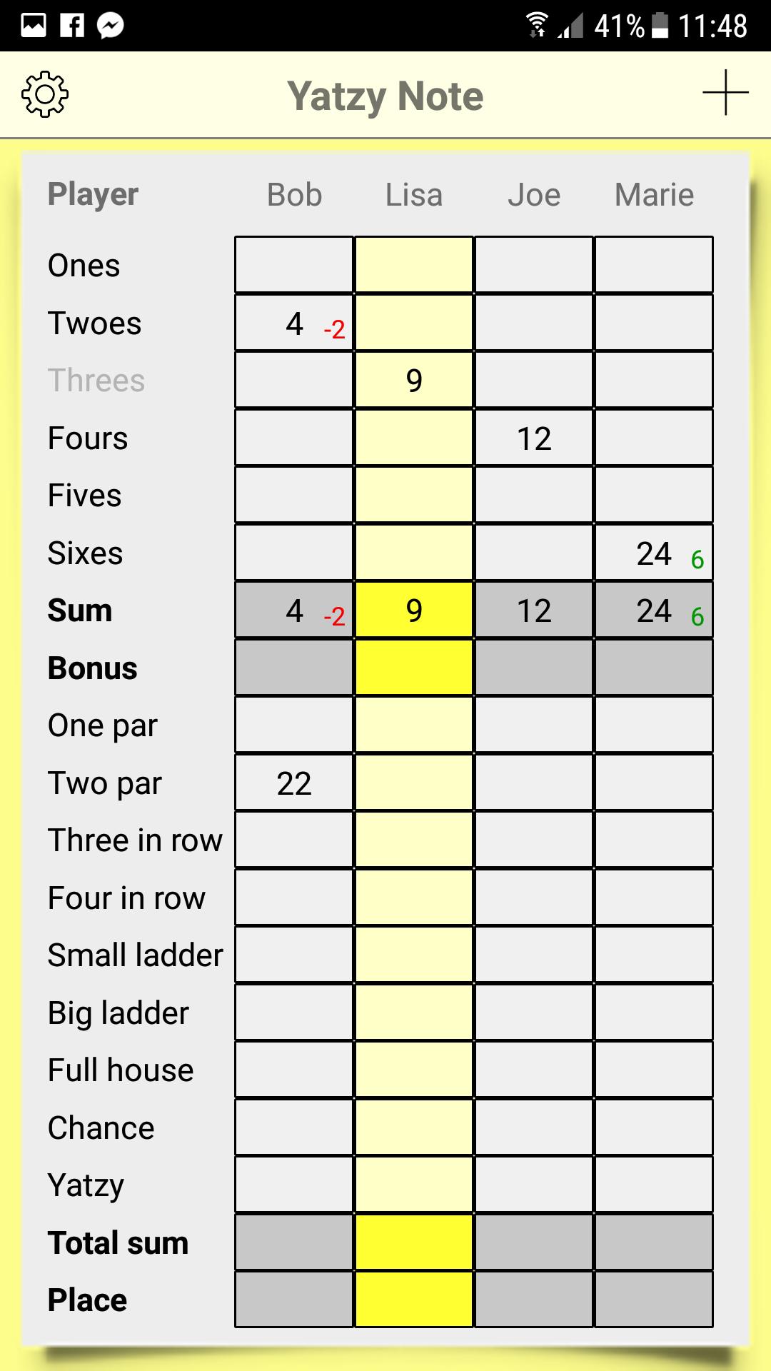 * Perbedaan untuk mencapai Bouns - Yatzy Note akan menunjukkan berapa banyak poin yang Anda sebelum atau sesudah mencapai boun, sekali lagi untuk memastikan bahwa Anda akan lebih menikmati permainan daripada harus menghitung diri sendiri.
