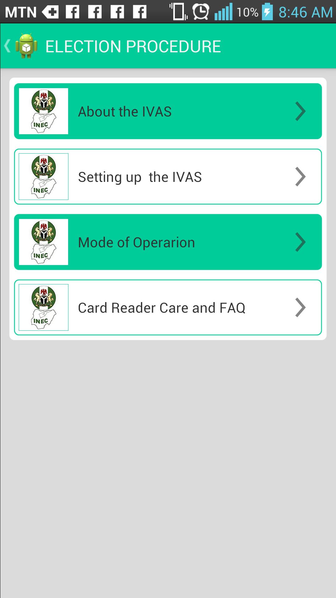 INEC NIGERIA 2015 General Election Training Manual Mobile Application contains‘’ all the processes involved in the election, how to use the PVC Smart card reader and election offences and their sanctions, and guidelines for the electoral officials.