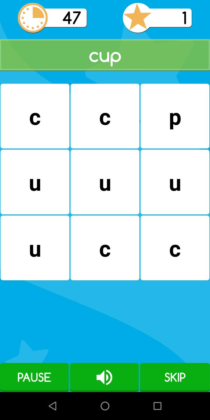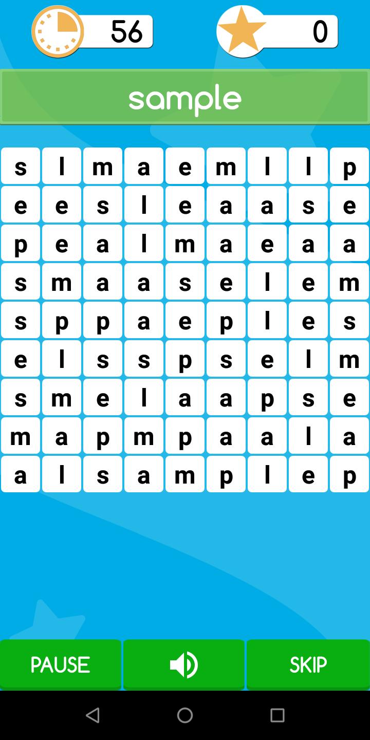 ユーザーが最善を尽くして、すぐにできるだけ多くの単語を見つけるゲーム。単語はグリッドに一度だけ表示されます。ユーザーのニーズに応じて、3つのレベルが簡単で、中程度で、ハードがあります。