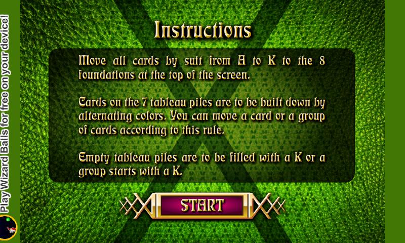 このゲームの2つのデッキを使用して、このゲームの目標は、すべてのカードをスーツでAからKに財団に移動することです。 8つの空の基礎を開始すると、画面の上部に配置されます。基礎の下の7つのタブロー山のそれぞれは、表面的と顔を交互に交互に並べられた7枚のカード(タブローの山の最初のカードは表向きで、2枚目のカードは顔が下り、3枚目のカードは顔が上になります。) Tableau Pilesは、色を交互に構築する必要があり、そのたびに、このルールに従ってカードまたはカードのグループを別のTableau Pileに移動できます。 Tableau Pilesの対面カードは、それらの上のカードが削除されると、表面上に向き付けられます。 Tableau Pileが空になった場合、Kを移動したり、グループがKで開始したりできます。廃棄パイルのトップカードは、タブローパイルまたはファンデーションに移動できます。動きが足りなくなった場合は、ストックパイルをクリックして、廃棄パイルに新しいカードを配ることができます。しかし、ストックパイルが空になり、これ以上動きができない場合、負けます。