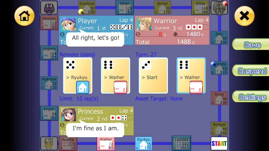 カードを選択し、マップを介して進行します。あなたがスペースに着陸するとき、何かが起こるかもしれませんし、あなたが不動産を買うことができるかもしれません。