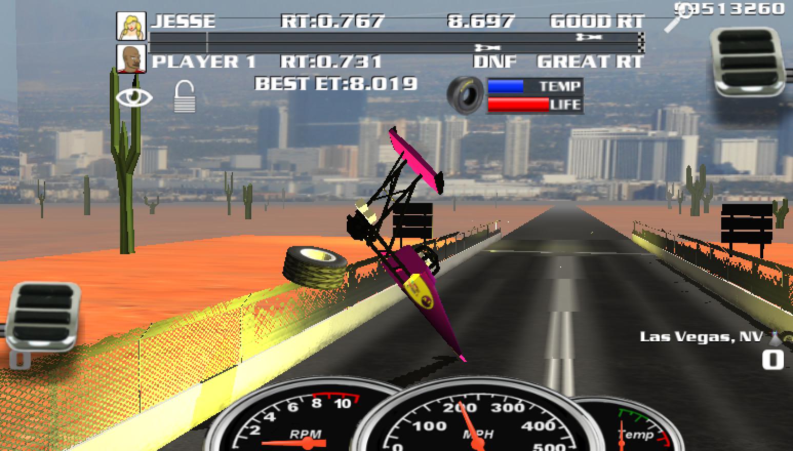 Burn Out 、ガッサー、メタン、亜硝酸またはNOS駆動のドラッグスター、レール、面白い車、ジェットカー、またはオートバイに燃料を供給して、新しいエディションで戻ってきます。次に、スニーカーを加熱し、トラックを取り壊すとゴムを置き、完全な反応時間、RT、および推定時間ETで支配を確立します。
