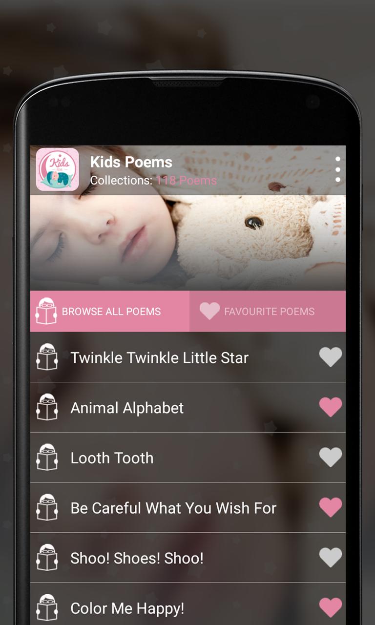あなたの検索が古典的な子供の詩であろうと子供のための現代の詩のいずれであろうと、あなたは私たちのアプリケーションのKids Poemsであなたが選んだ子供のための詩を見つけるでしょう。
