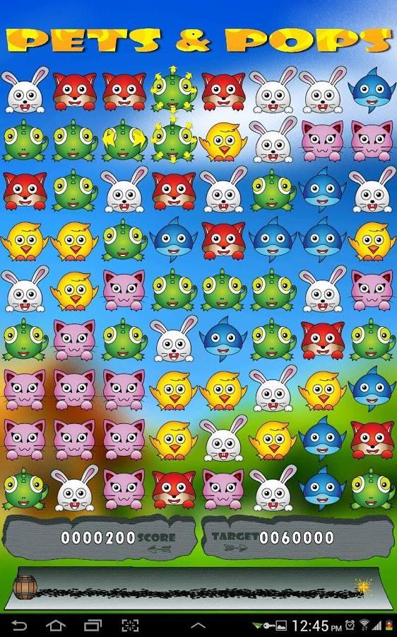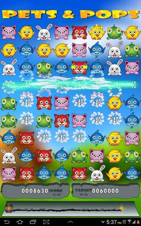 同じ色の3つ以上のペットを集めて消えます。水平、垂直、または斜体のラインを作ることができます。次のレベルに渡すには、合計目標を取得する必要があります。