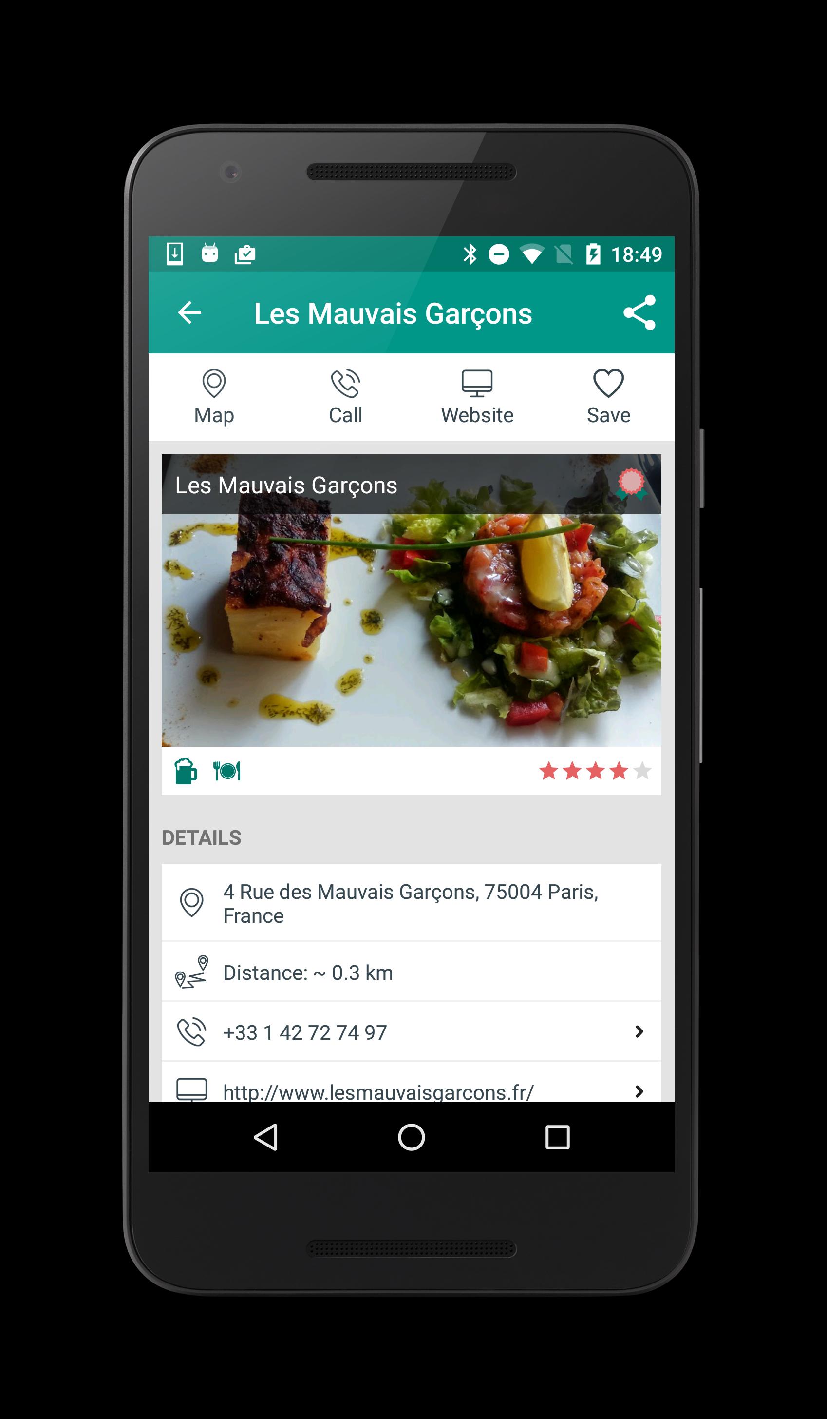 •各場所の詳細には、評価、住所、電話番号、画像、現在の場所からの距離、ウェブサイト、ユーザーレビュー、労働時間、価格レベルが含まれます。
