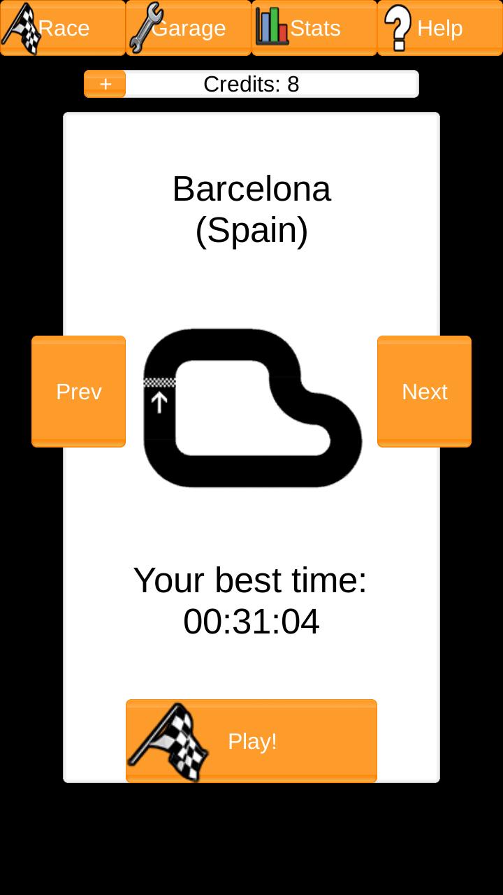 はい?その後、 Pole Position Car Racingをプレイして、レーストラックでフォーミュラカーを運転する方法を証明します(バルセロナ/スペイン、モンツァ/イタリア、ポルトガル、サンパオロ/ブラジル、サキル/バレイン、ホッケンハイム/ドイツ、ドイツ、スパ/ベルギウム、バレンシア/スペイン、アウシチン/アメリカ合衆国アメリカ、アブダビアマン