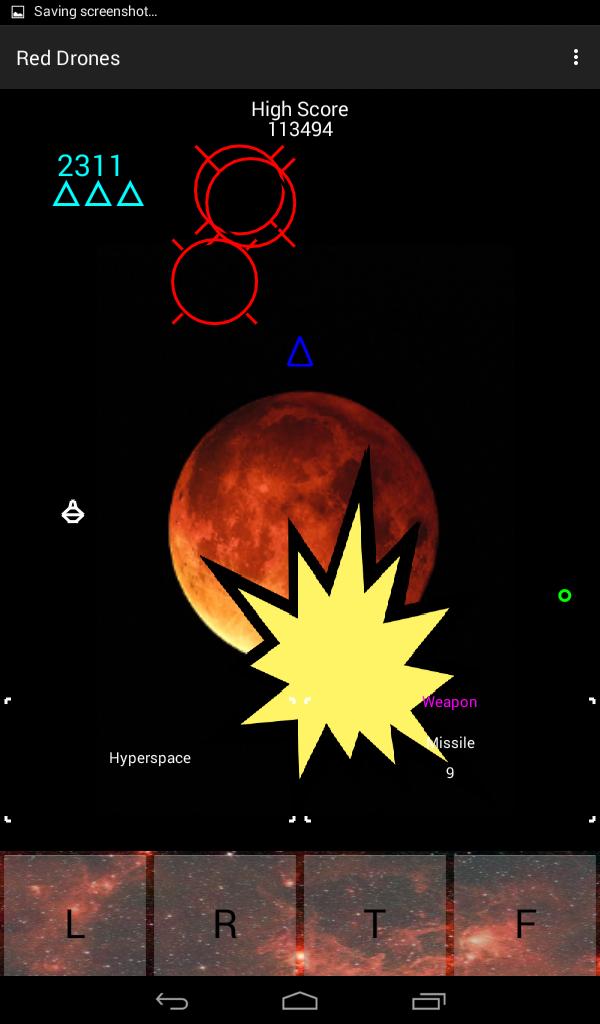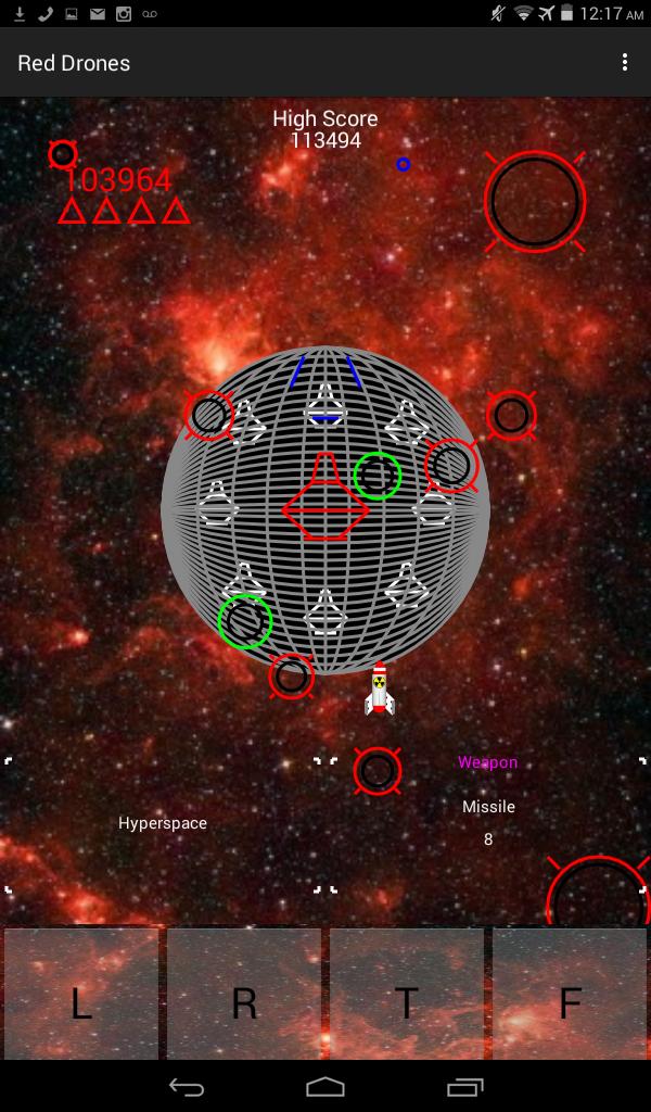 ドローンとアンドロイドパトロール船だけを破壊できる砲兵が装備されています。 Android Planetを破壊するには、グリーンドローンをハイジャックし(衝突)、ミサイルを取得する必要があります。 Red Dronesと衝突しないでください。 Android惑星は、Pl王星と小人惑星エリスを過ぎています。 Android惑星に到達し、それを破壊します。地球の人々はあなたに依存しています。!!!