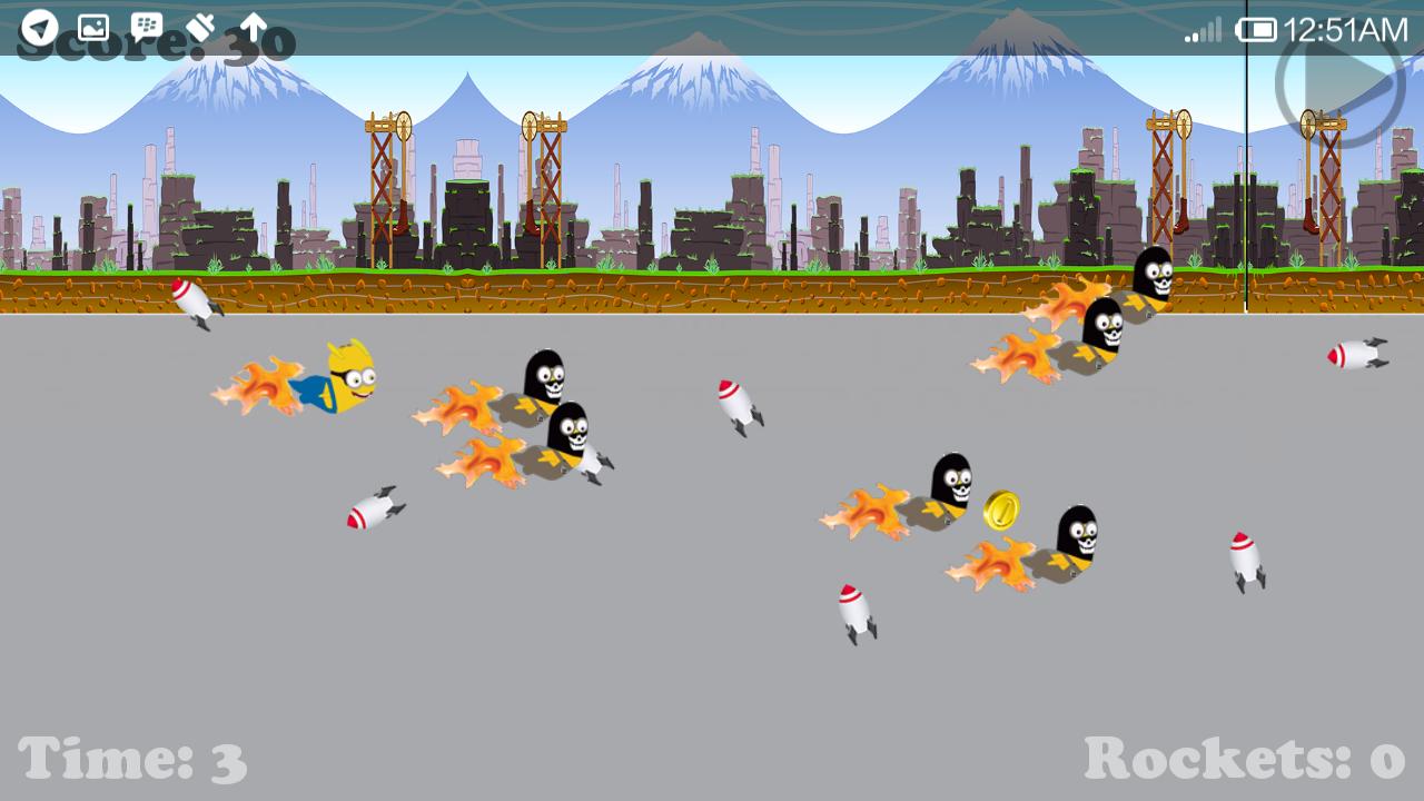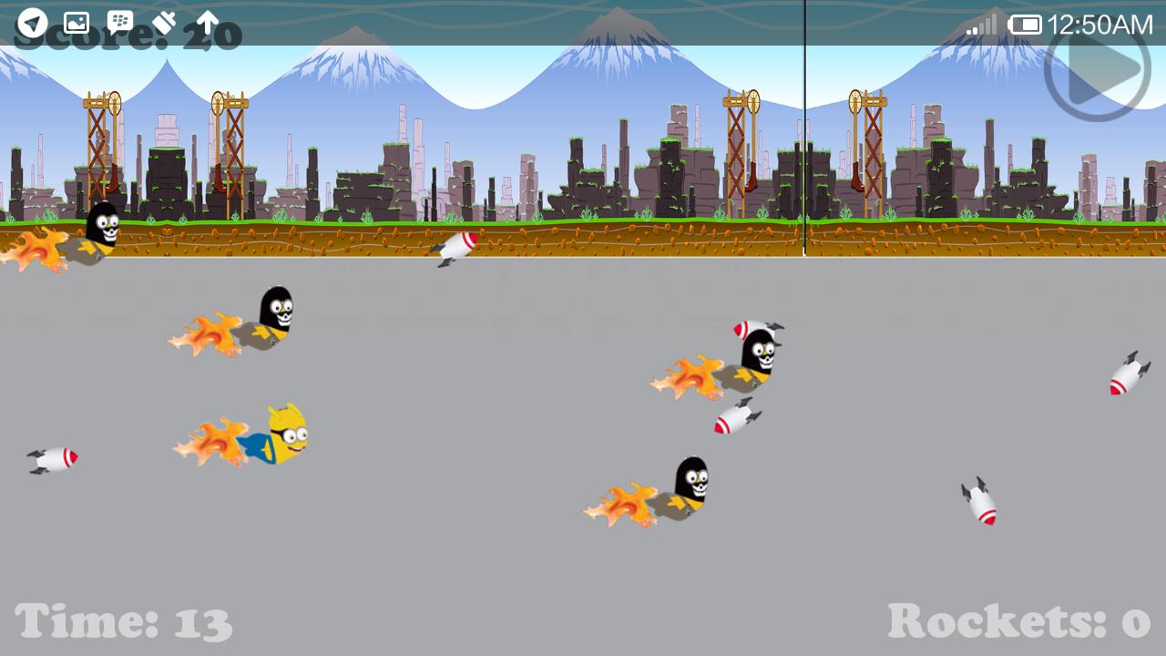 それは、SlugterraのSlugやMinionキャラクターのような新しい良いフライゲームと卑劣な私です。空にロケットを集めてから、火災ボタンを押してロケットを起動してグールを爆発させます。また、コインを収集する必要があります。そうしないと、ゲームが終了します。他のグールとの衝突は避けてください。スラグをついに他の人よりも速く運転してゲームに勝ち、リーダーボードでハイスコアを獲得することを願っています。楽しむ!