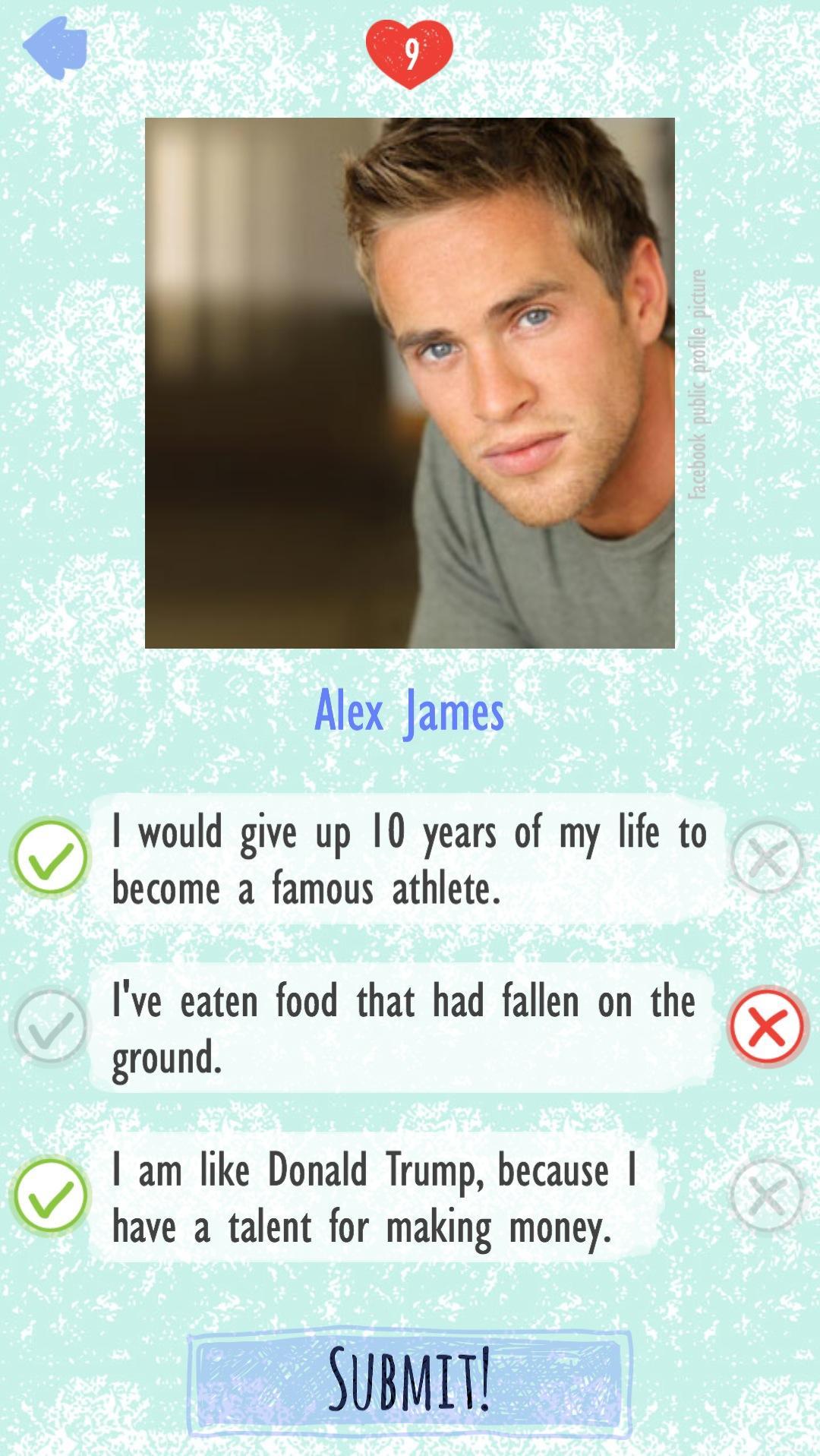 あなたとあなたの友人はそれぞれ2つの真実を言い、1つは自分自身について嘘をつきます。目標は、実際にどの声明が嘘であるかを把握することです!
