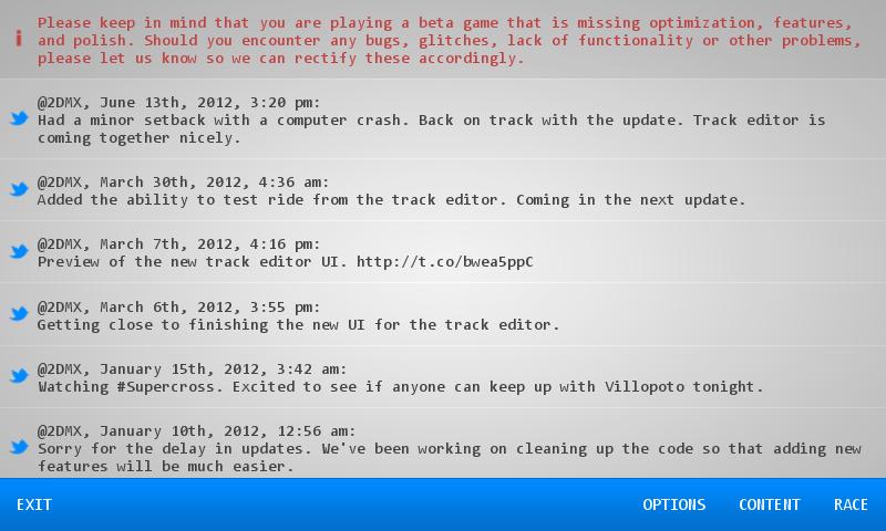 안드로이드 장치 용 2D 모토 크로스 레이싱. 다양한 트랙에서 시계와 경쟁하십시오. 재미있는 트랙을 만들 수 있다고 생각하십니까? 트랙 편집기와 함께 가서 상상할 수있는 모든 것을 구축하십시오.