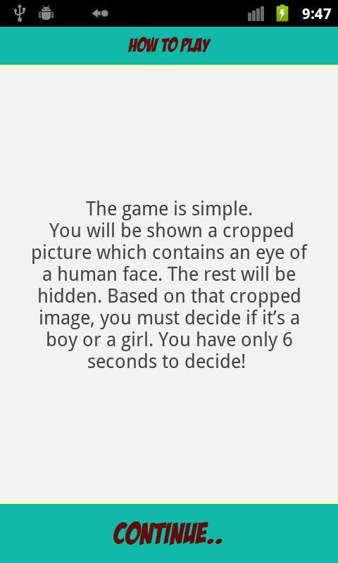게임은 간단합니다. 당신은 인간의 얼굴의 눈이 들어있는 자른 그림이 표시됩니다. 나머지는 숨겨 질 것입니다. 그 자른 이미지를 바탕으로 소년인지 소녀인지 결정해야합니다. 결정하는 데 6 초 밖에 걸리지 않습니다!