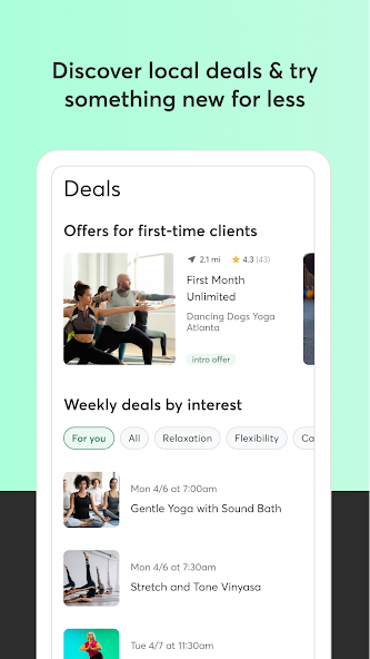 전 세계 40k+ 스튜디오를 통해 요가, 필라테스, 바레, 댄스, 히트, 부트 캠프 등과 같은 최고의 피트니스 클래스를 제공합니다. 마사지, 모발 치료 또는 냉동 요법의 선을 따라 무언가를 찾고 계십니까? 우리도 그것을 얻었습니다. 또한 홍보 된 소개 제안 및 마지막 순간 거래를 찾을 수 있습니다.
