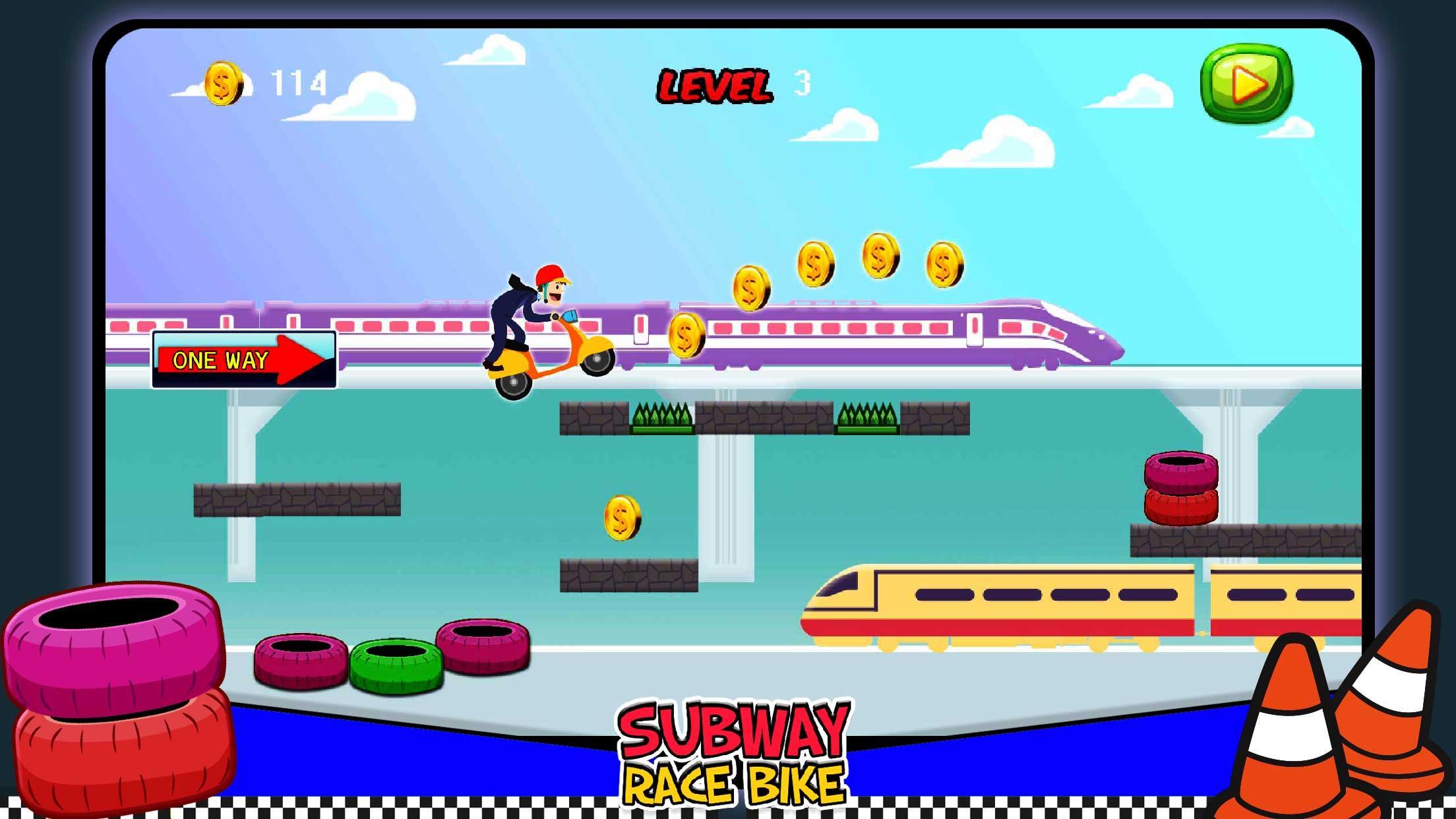 Subway Race Bike 기차와 다른 장애물을 피하고 길에 동전과 다른 음식을 모아서 앞으로 나아가고 있습니다. 승자가되기 위해 위험 장애물을 뛰어 넘으십시오. 이 Subway Race Bike 게임은 훌륭한 그래픽, 간단한 컨셉 및 쉬운 스크린 컨트롤로 멋진 레이스 경험을 제공합니다.