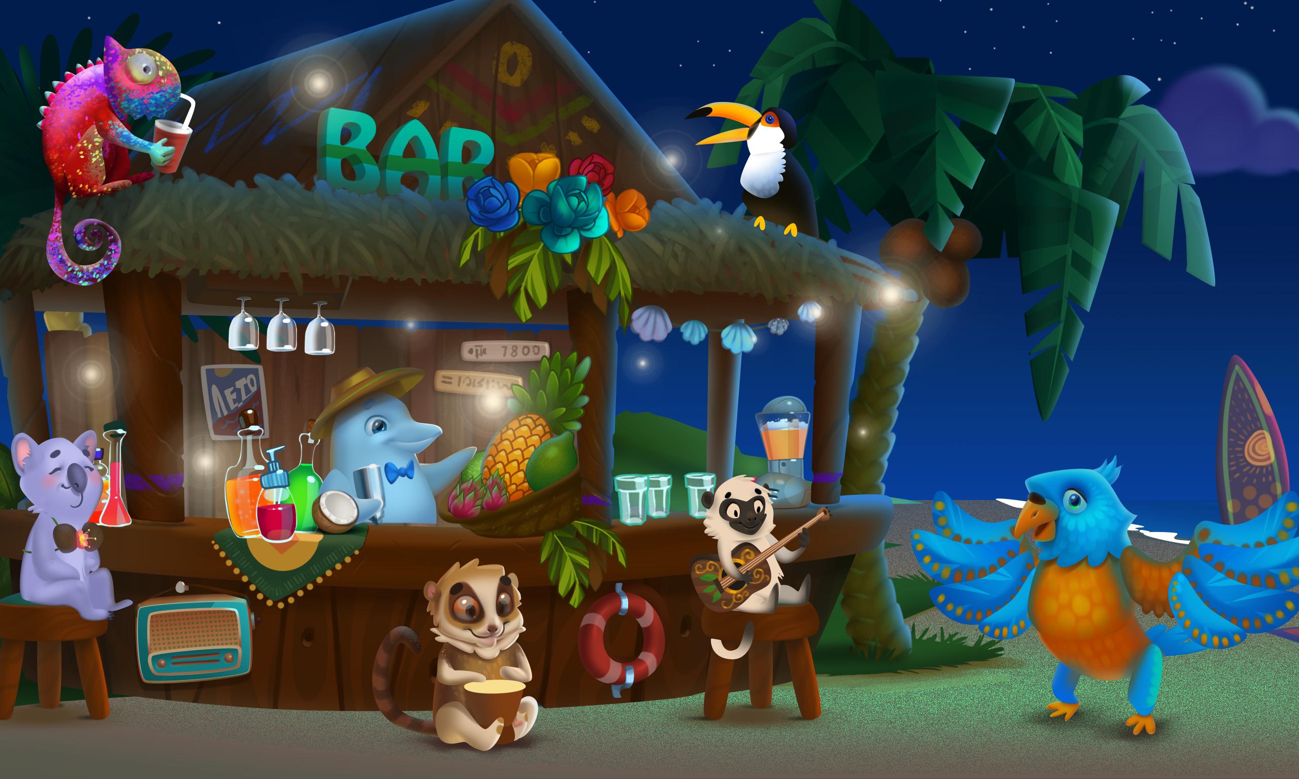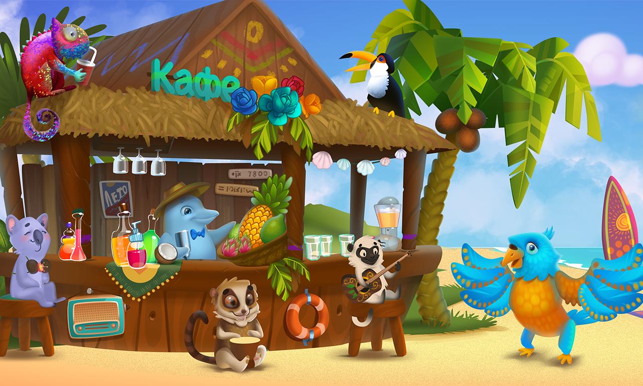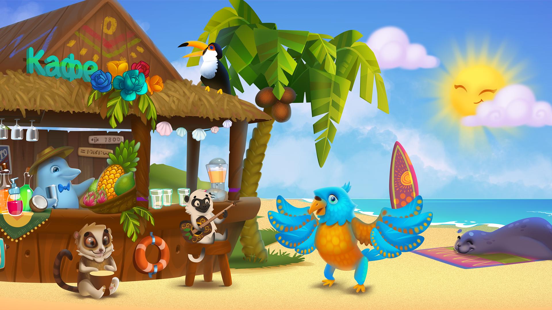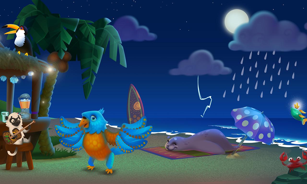 Funny animal band with different musical instruments rehearses their songs on the tropical beach. Play with them using any objects on the scene, manage the band and create wonderful tunes!