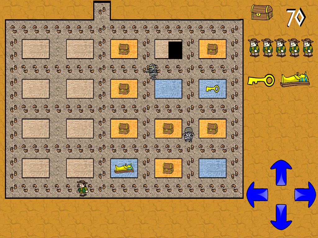 Each level contains 10 treasures, 6 empty cells and the rest a mummy, a keeper, a key and a certificate.