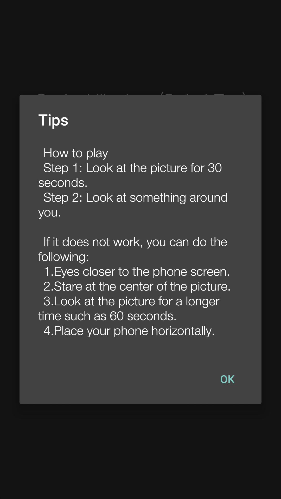 Select one illusion then get ready and keep your mobile device (phone or tablet) about 25 cm in front of your eyes, then follow the instructions stated on the game, they will guide you on the process and shall provide tips on how to improve the visual effect.