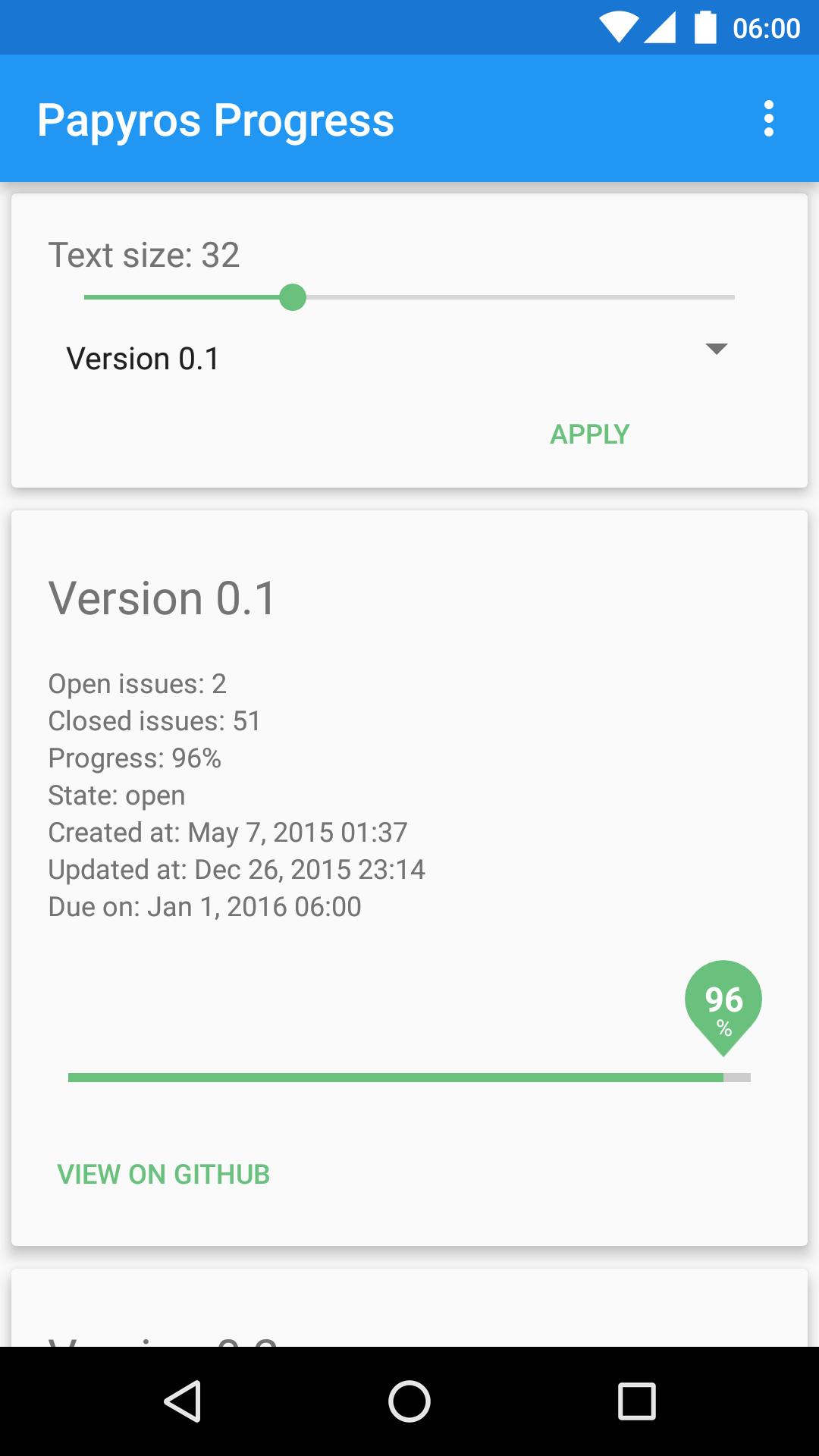 Papyros is a new operating system, currently in development. It uses Google's Material Design and is based on Arch Linux. Take a look at the homepage: papyros.io. There is a progress bar showing the progress of the next release milestone. I have created two widgets to show the progress on the home screen of your Android device.