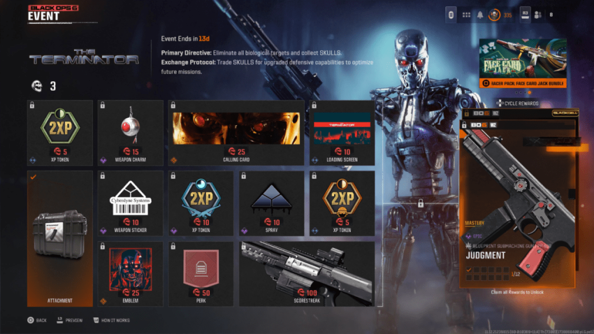 O Evento do Terminator no Black Ops 6 e WarZone Tassa os jogadores de encontrar crânios em fósforos e, em seguida, gastá -los para recompensas na guia Evento. Os crânios têm a chance de serem jogados no chão depois de obter eliminações no Black Ops 6 multiplayer e zumbis, ou ao abrir caches de pilhagem na zona de guerra .
