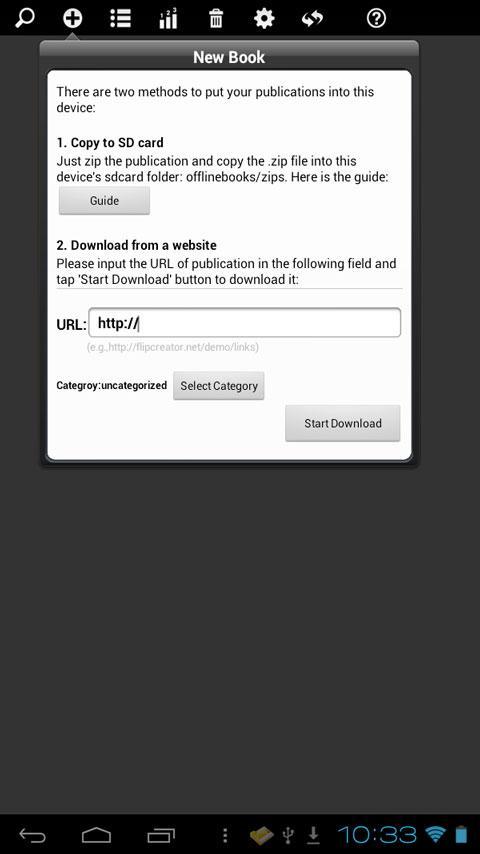 Toque no botão "Adicionar livro" e insira o URL da sua publicação e toque no botão "Iniciar Download" para baixá -lo.