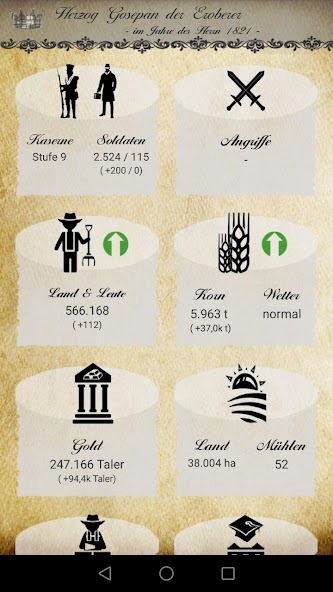 Ao gastar seu ouro em novas terras e usinas, você também aumentará sua renda. Existem também eventos gerais no mundo (historicamente preciso) que podem afetar seu império. Com o tempo, seu império aumentará e seu título também.