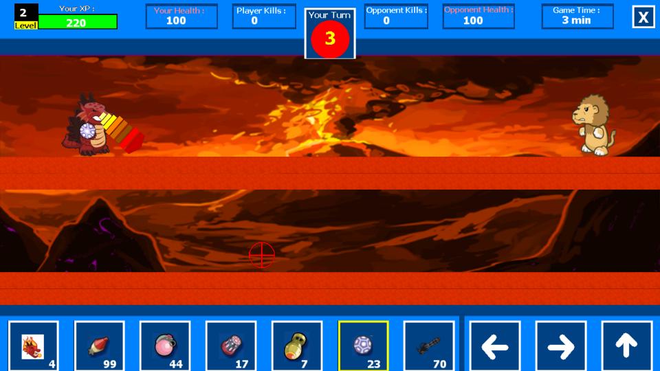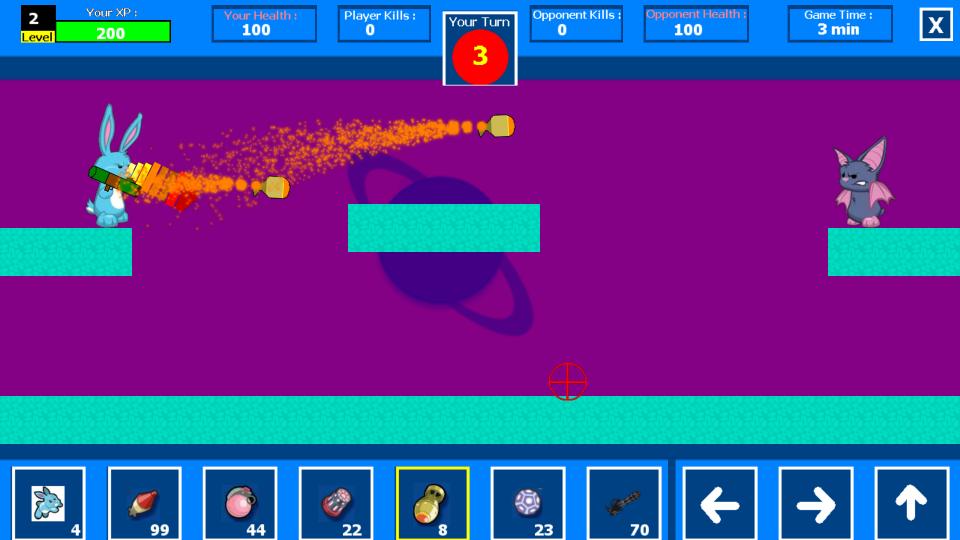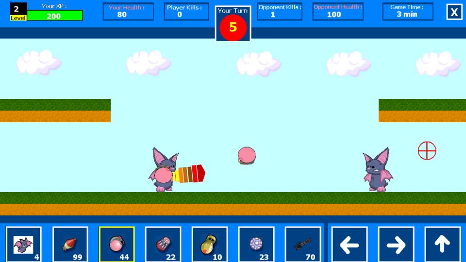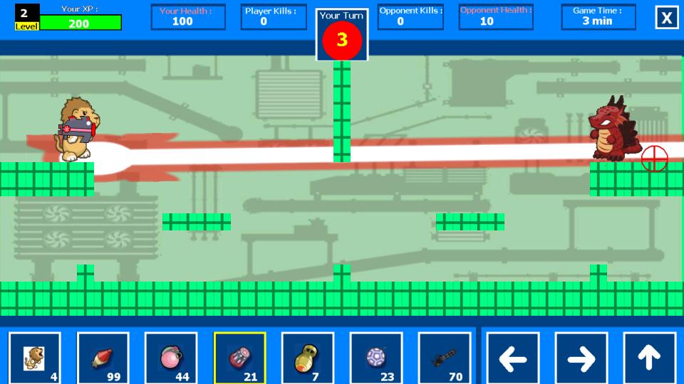 The game play is based on turns..you have to wait for your turn in order to play..tap on the weapons icons to switch weapons and tap on the "Shoot" icon to shoot or to activate pet's special ability (aim using your finger) the battle is 3 minutes long & each turn is 15 seconds long so you better use your turns wisely..get more kills than your opponent in order to win the game & get some good coins!