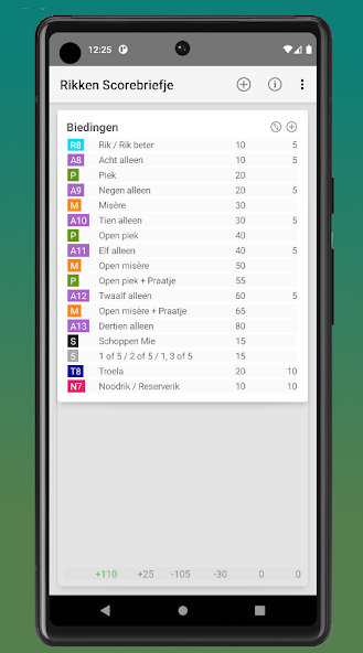 With this app you can easily keep track of the scores of the Rikken. Do you use different scores than standard? You can also customize those with this app.