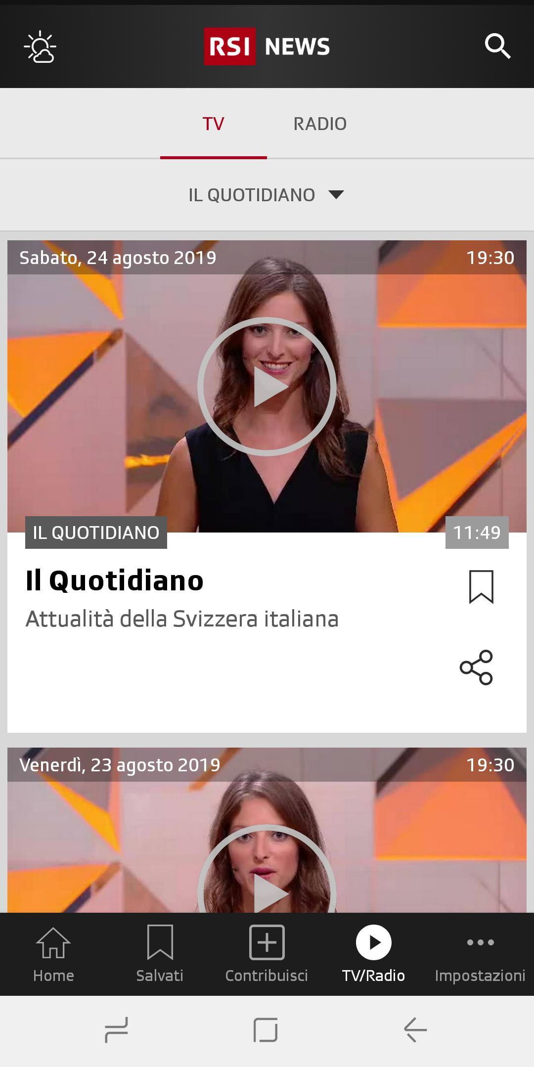 Our news always with you. CSR Information News is the application of the Swiss Radio (RSI). It allows you to accompany you with regional importance news, Swiss and international, economics, culture, curiosities and of course all the sports you love. The television and radio broadcasts in your hands, in front of your eyes so quick and easy. Find out which are the top stories or more views? Just a simple click. The weather? There is! It happens an event? Here are our live streaming! We interact? You can send us e-mail, photos and videos. And share articles and broadcasts on social networks. Or connect to the site www.rsi.ch. Or discover our other app. We are waiting for you. Some video content may only be viewable on Swiss soil.