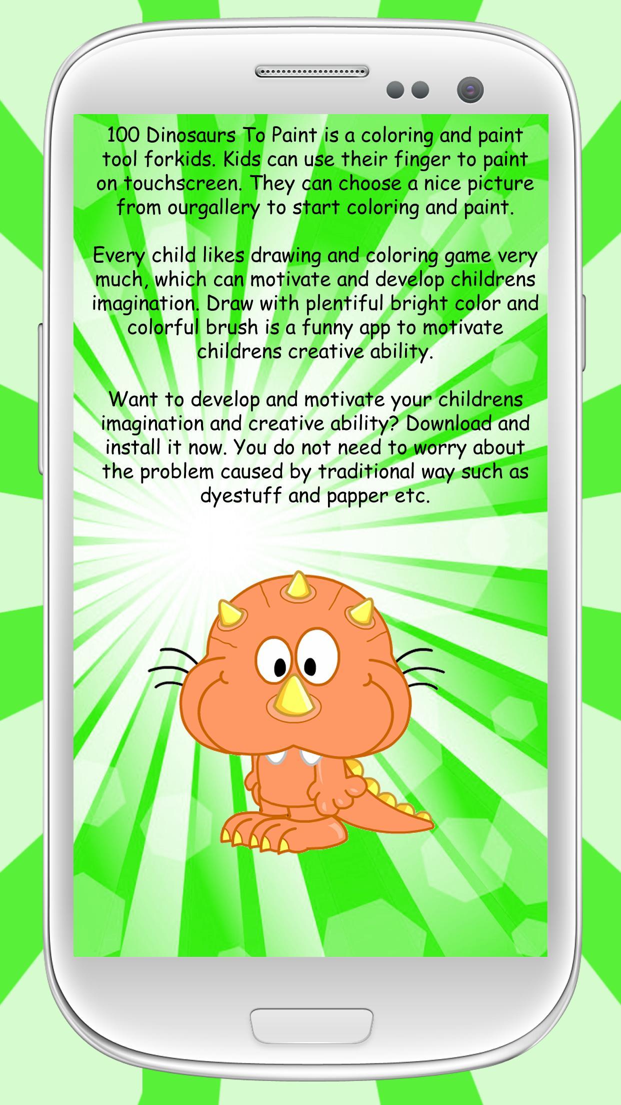 100 Dinosaurs To Paint - это инструмент для окраски для детей. Дети могут использовать его пальцы или легкую ручку для окрашивания на тактильном экране его планшета или интеллектуального телефона. Имеет широкую галерею, где можно выбрать большое количество изображений для цвета, а также сотни доступных цветов в нашей палитре.