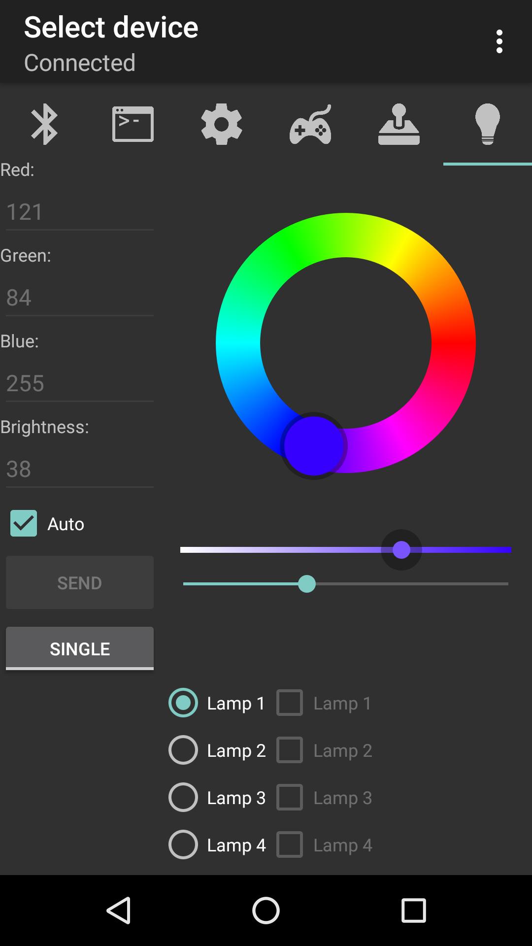 Вы хотите контролировать светлый цвет в своей спальне? Вкладка «Нет проблем». Вкладка 6 предлагает вам полный бесплатный программируемый цветовой писатель для отправки сообщений и цвета над Bluetooth, вы также можете отправить светлоподресность, если хотите. Вы можете управлять до 4 различных ламп. Вы можете установить их вместе на один цвет (установите Togglebutton на флажки) или установить каждую лампу на другой цвет (Togglebutton на радиобултоны).