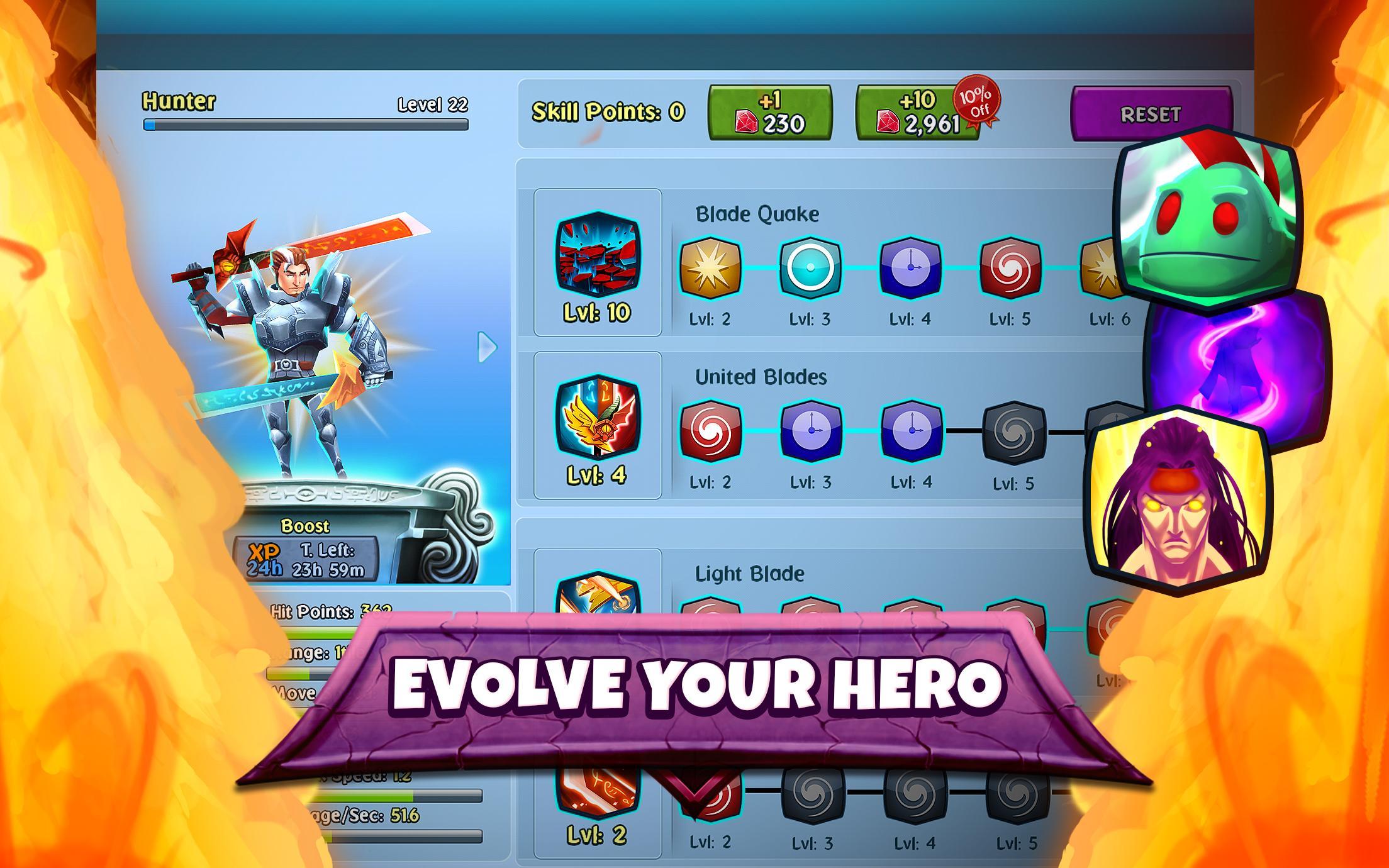 - Уровень 5 мощных героев с уникальными способностями и разными стилями игры