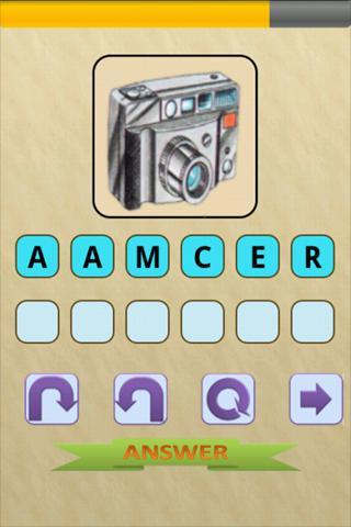 Это слово «скрасная игра», которая позволяет вам создавать опыт для Scrabble, Crosswords и других слов. Новая вещь в этой игре в том, что вы можете увидеть изображение ответа. Вам нужно перетащить буквы в нижнюю, чтобы создать правильное написание изображения показанного. Игра предназначена и для детей (легких) и молодых (жестких). Чтобы сделать его более сложным, существует таймер (30 сек) после того, как будет отображаться правильный ответ.