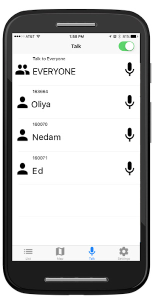 Чтобы Walkie-Talkie с пользователями в вашей группе, перейдите в список пользователей, а затем удерживайте кнопку «Микро» на человека, которого вы хотите пообщаться. Кнопка отпускания, когда закончите. Вы также можете транслировать всем в вашей группе, нажав кнопку «Все» сверху.