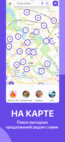 A profitable card is a tool that helps you find promotional offers near you. Convenient function of determining your location “I’m here”. Partner companies are displayed on the map with a price or logo.