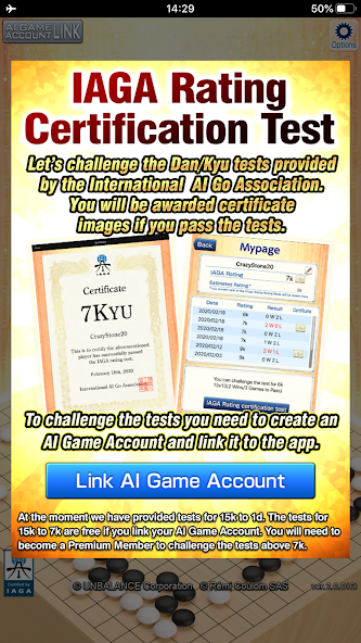ท้าทายการทดสอบ DAN/KYU ที่จัดทำโดย International AI GO Association คุณจะได้รับภาพใบรับรองหากคุณผ่านการทดสอบ
