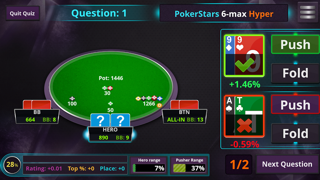 โค้ชโป๊กเกอร์ Push/Fold ICM ส่วนตัวของคุณพร้อมที่จะเพิ่มทักษะการกด/พับของคุณได้อย่างรวดเร็วและมีประสิทธิภาพ 24/7