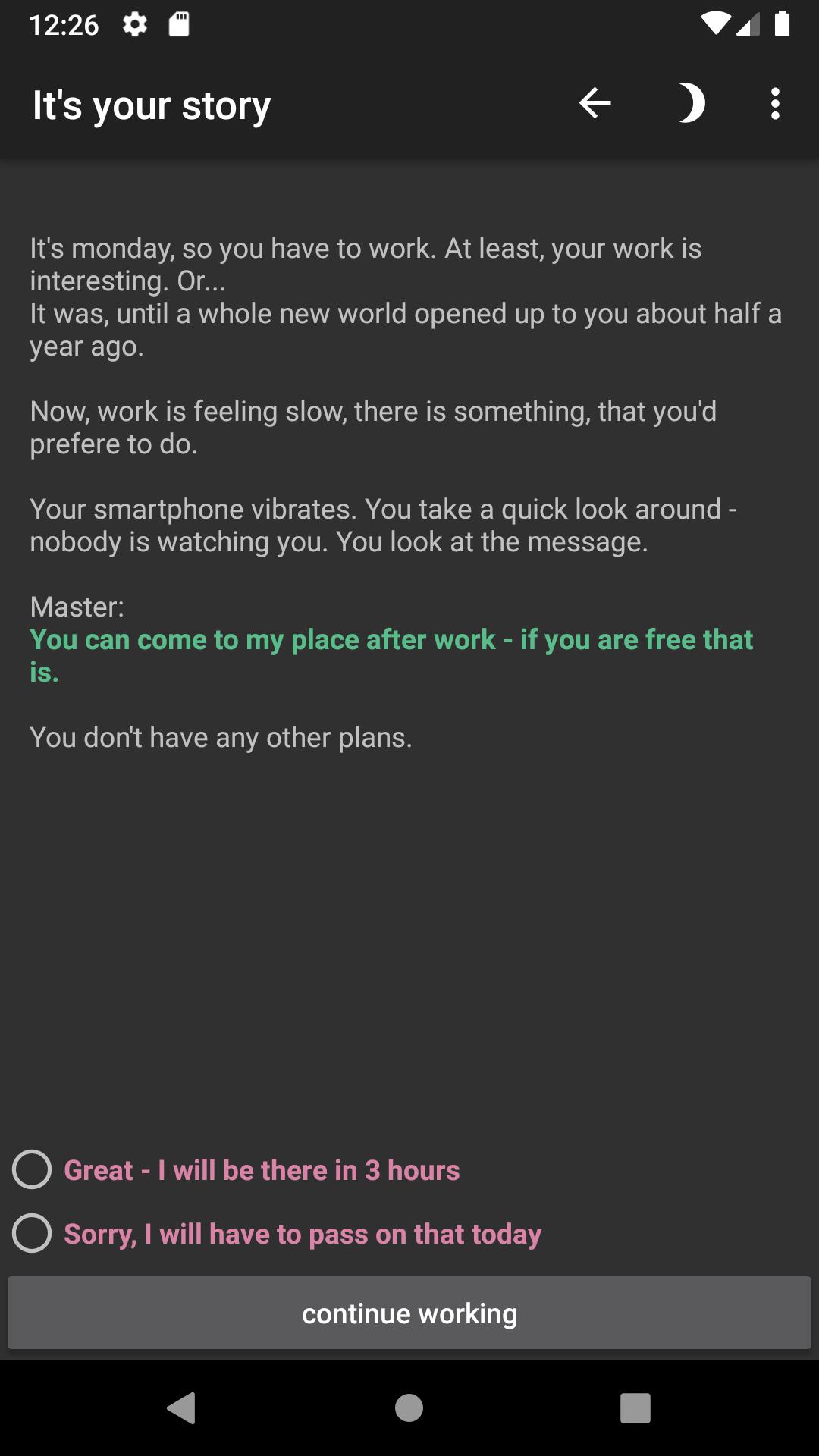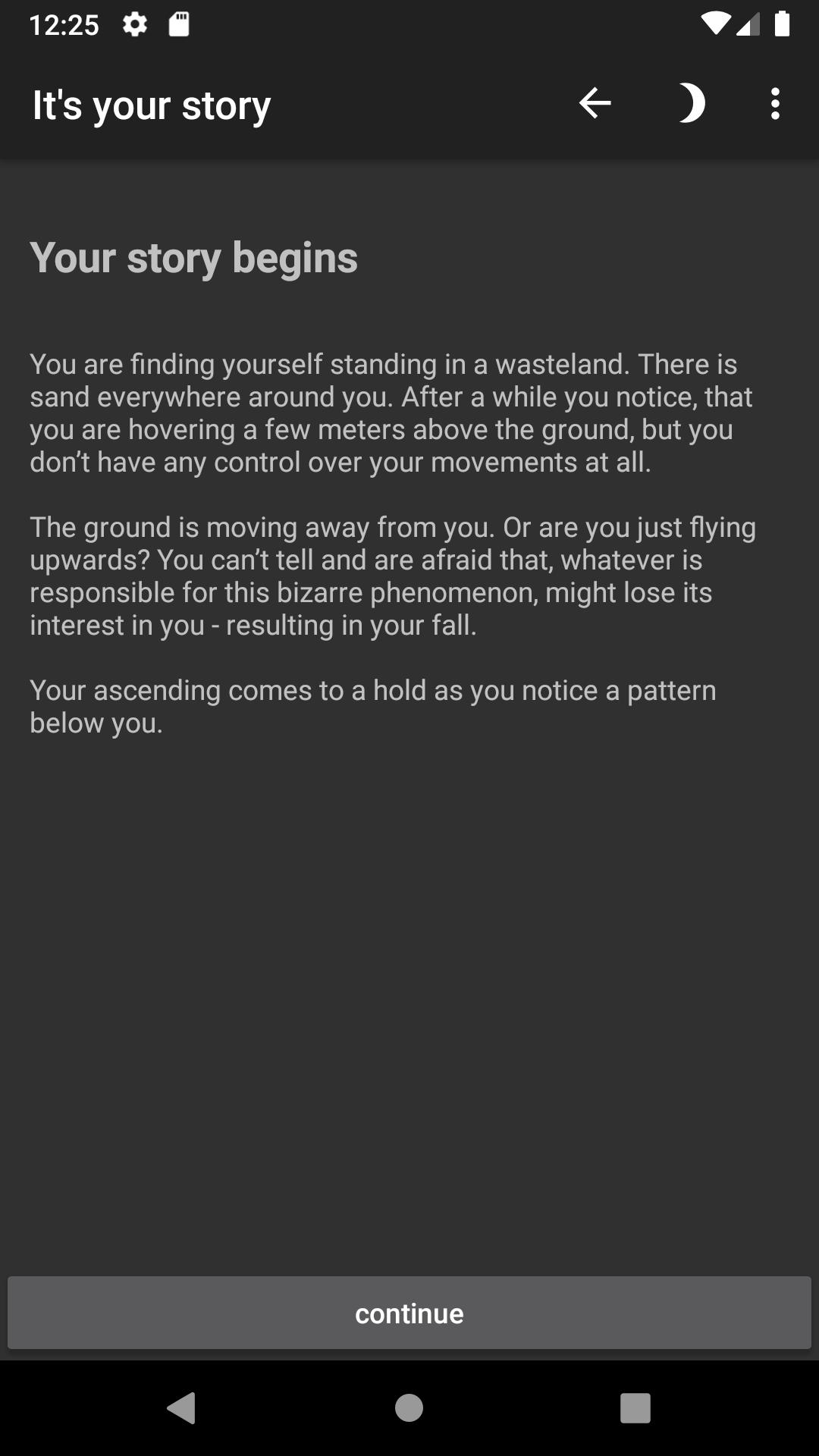 ฉันกำลังเขียนโปรแกรมแอพนี้ในเวลาว่างและไม่ทำเงินใด ๆ กับมัน จะไม่มีการเพิ่ม ไม่มีในการซื้อแอพ และเนื่องจากเป็นการผจญภัยข้อความ "เพียงแค่" ฉันไม่จำเป็นต้องได้รับอนุญาตจากอุปกรณ์ของคุณ