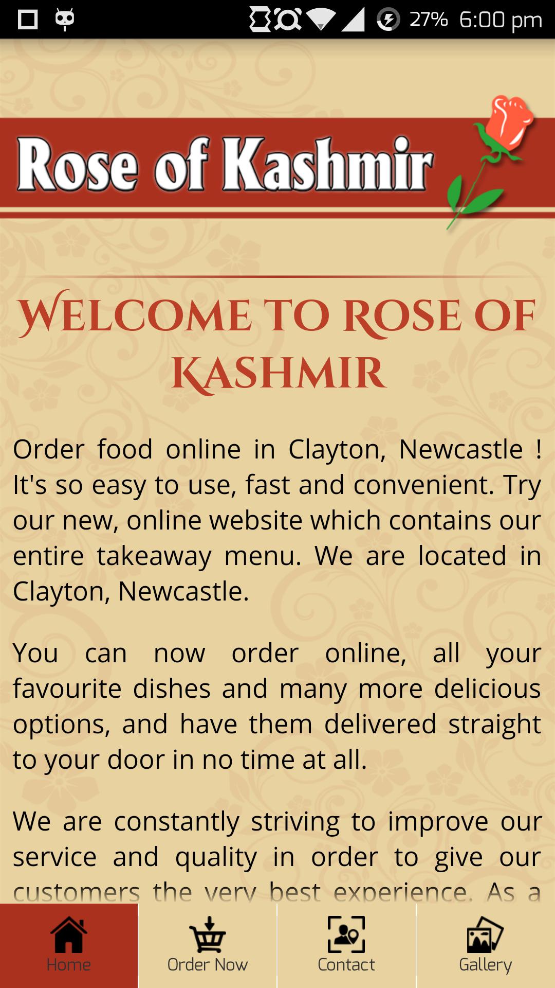 ขอบคุณสำหรับการเยี่ยมชม Rose of Kashmir ใน Clayton, Newcastle เราหวังว่าคุณจะเพลิดเพลินไปกับแอพสั่งซื้อออนไลน์และอาหารของคุณ