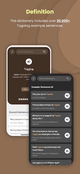 สำหรับผู้เรียนระดับกลางและขั้นสูงแอพนี้มีคุณสมบัติขั้นสูงเช่น: ตัวบ่งชี้ความถี่ของคำโปรแกรมการวิเคราะห์ Affix เพื่อแนะนำว่าสิ่งใดที่อาจใช้กับคำใด ๆ ที่คุณพบและคลังข้อมูลที่ค้นหาได้ขนาดใหญ่ของข้อความภาษาตากาล็อก