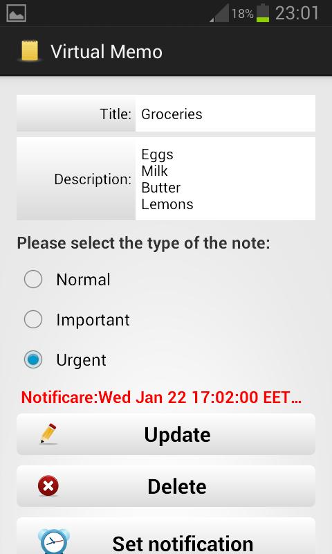 Virtual Memo เป็นแอปพลิเคชันที่จะช่วยให้คุณจดจำงานทั้งหมดที่คุณต้องทำ คุณสามารถเพิ่มโน้ตและหลังจากเสร็จสิ้นคุณสามารถอัปเดตหรือลบได้