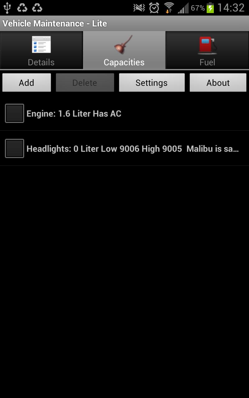 Vehicle Maintenance is used to keep track of information related to your vehicle. The capacities of your vehicle's various systems can be entered for easy reference. Fuel purchases can be entered and used to track your vehicle's fuel economy.