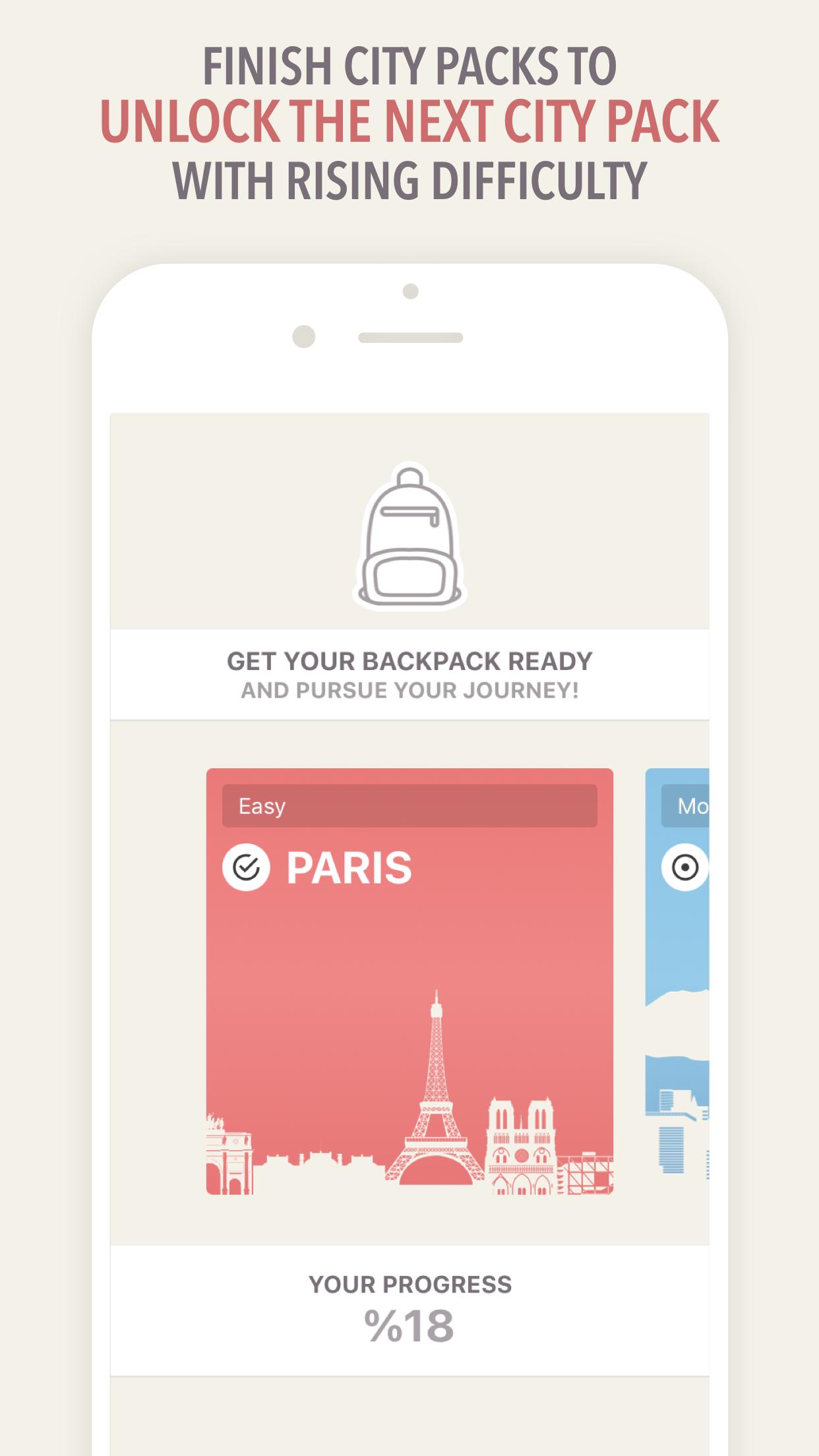 With the backpacking concept, playing Wordpack is really enjoyable. Visit up to 7 cities and play 15 city levels on each city to unlock the next city pack! With hand crafted 100+ challenging puzzles, you will never get bored!