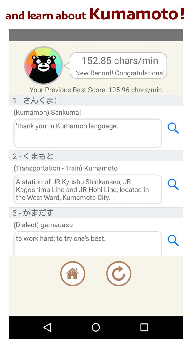 FlicKuma!是一款使用Flick输入输入日语时提高打字技能的应用程序。在此应用程序中,您的导师是库玛蒙(Kumamon),库玛蒙(Kumamon)是日本库曼莫托县的吉祥物,您将键入他展示的单词。所有单词都与Kumamoto有关,因此您还将在输入时了解该区域!