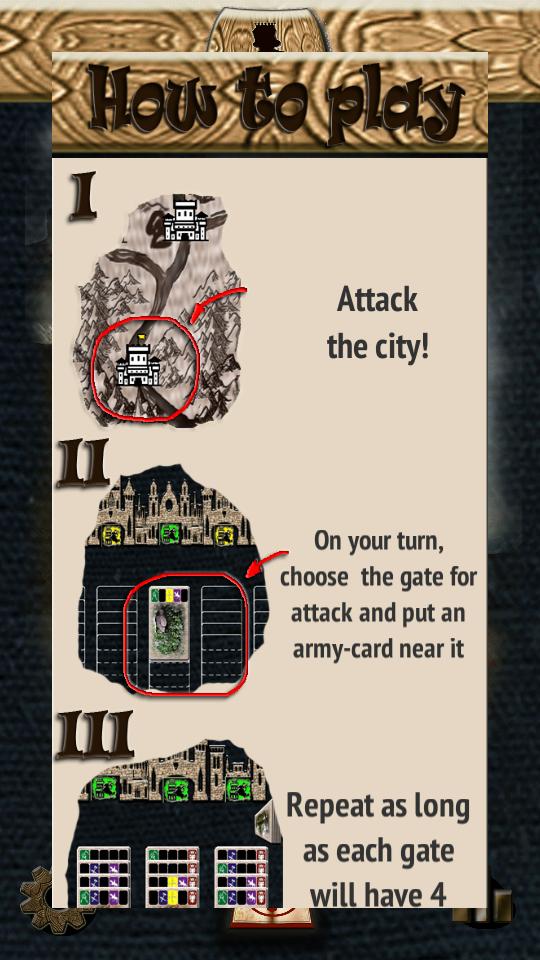 在五个地区攻击城市。在他们的每一个上收集一支强大的军队,并捕获城市大门。捕获比对手更多的大门,这座城市将被带走!