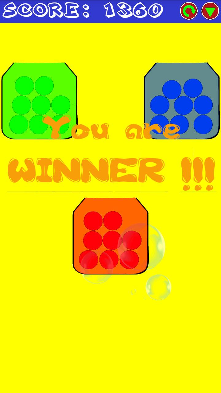 该游戏包含一个有趣的动作和一定的策略。这是我们童年时期的替代游戏。玩家应该具有逻辑,注意力和反应。由于设备的重力变化,游戏快球正在移动。另外,他们由于触摸屏幕而跳跃。您需要将所有球发送到盒子中。但是您应该以这种方式做:当绿色球进入绿色盒子时,红色进入红色盒子,蓝色进入蓝色盒子。当所有的球都相同的颜色进入他们的颜色盒子时,盒子就会关闭。