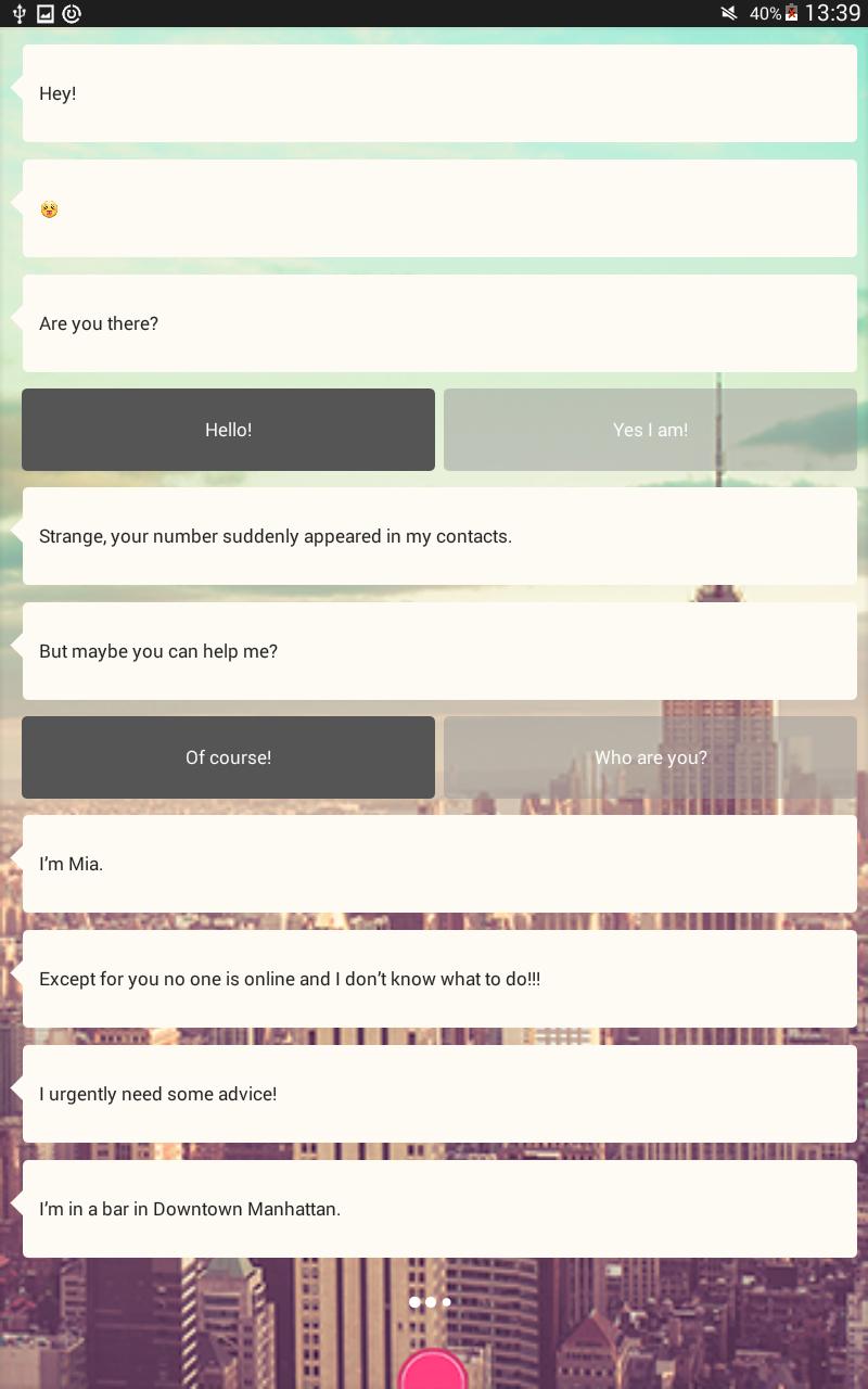 MIA的信息直接从曼哈顿实时与您联系。您可以选择:立即或以后回答。 Mia问您问题,您的答案将决定她如何进行。