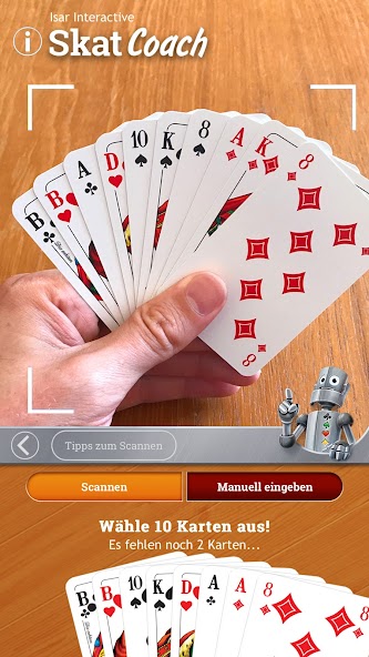 我们已经开发了用于图像分析的新算法,尤其是对于Skat Coach ,它使用手机摄像头识别您的卡片。 Skat Coach认识了法国卡的脸。该检测是针对屁股Altenburger扑克牌进行了优化的。另外,您可以手动输入卡片。