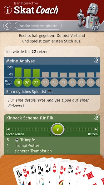 *如何单独评价我的卡片?除了分析外, Skat Coach还向您展示了Kinback计划。您可以自己评分床单。这很容易记住,并且是一个很好的指南,可以明显改善您的游戏。
