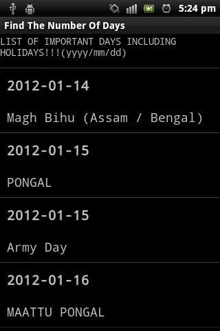 随时间显示两个选定之间的天数。您还可以在选定的日期之间查看重要日子的清单,包括假期(2012年),其中包含详细信息。目前包括特定的印度节日日期。进一步的更新还将包括许多特定国家的节日日期。